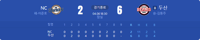 어제는 NC가 2회에 점수를 뽑기 시작했는데 오늘은 두산이 2회에 2점홈런으로 득점하기 시작했습니다.