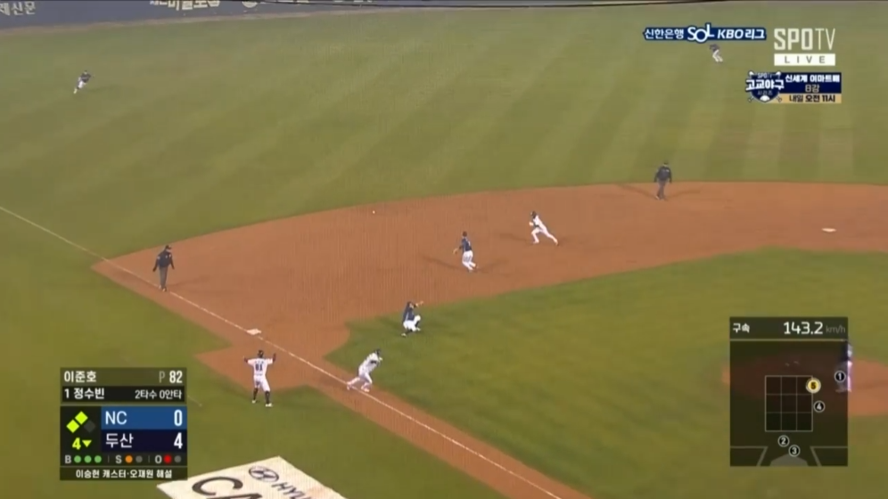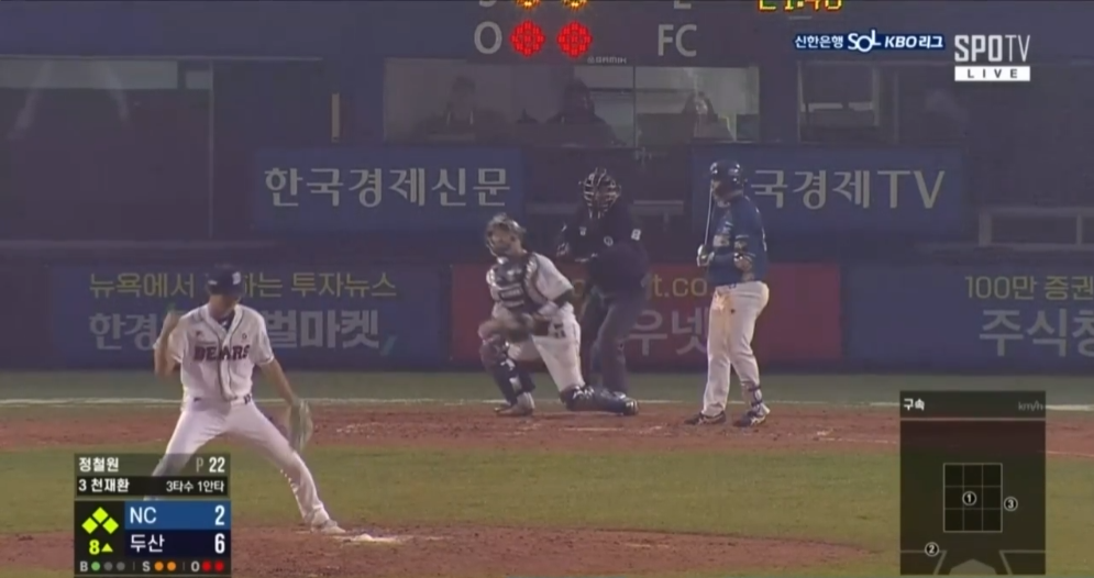 이어서 1번타자 정수빈은 3루쪽 라인드라이브성 타구를 날렸는데 3루수 글러브에 맞고 뒤쪽으로 굴러갔는데