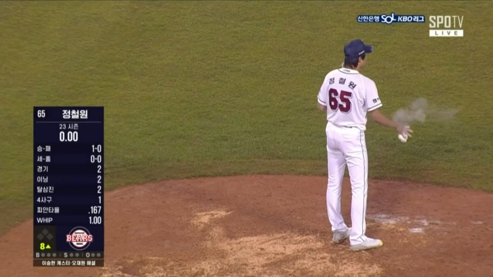 8회도 7회와 같이 투아웃에 만루상황이 왔는데요. 정철원투수가 삼진으로 해결합니다