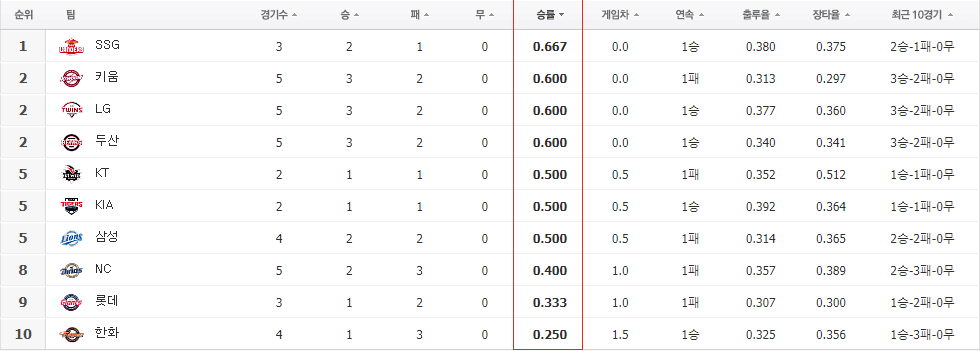 승률 5할을 지키던 두팀은 조금 갈렸습니다. 두산은 3승 2패로 공동2위로 NC로 8위로 조금 쳐져 있지만