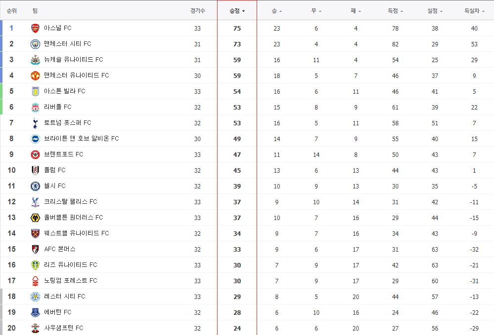 1위 경쟁 두팀의 승점이 유난히 잘 보이네요 살얼음판의 아스널은 나머지 경기를 어떻게 잘 풀어갈지도 궁금합니다