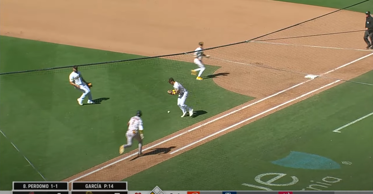 8회초 애리조나공격 원아웃 주자3루 상황에서 이번에도 페도모 선수가 3루주자를 들여보내기 위해 1루쪽으로 번트를 했는데 너무 강하게 맞아서 홈에서 아웃이 될수도 있는 상황이었는데 1루수가 급한마음에 공을 잡다가 실수를 해서 놓칩니다