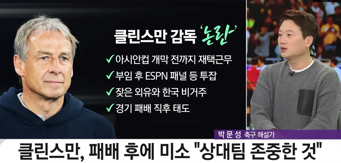 어쨋든 클린스만 감독이 그동안 워낙 실패를 감독으로서는 했고 이렇게 말씀드리겠습니다. 국제 무대에서 감독 클린스만 평가가 끝난 분입니다. 감독으로서는 이미 경쟁력이 없다라고 끝난거죠.