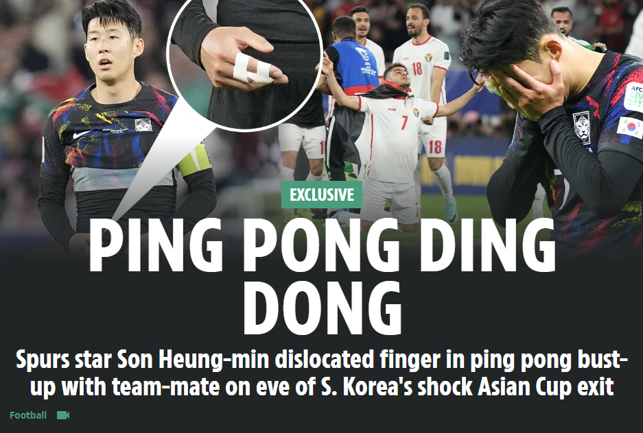 더 선의 기사내용 링크입니다. (핑퐁딩동 : 스퍼스 간판스타 손흥민 한국 충격 아시안컵 퇴장 전날 팀 동료와 핑퐁 몸싸움에 손가락 탈구)