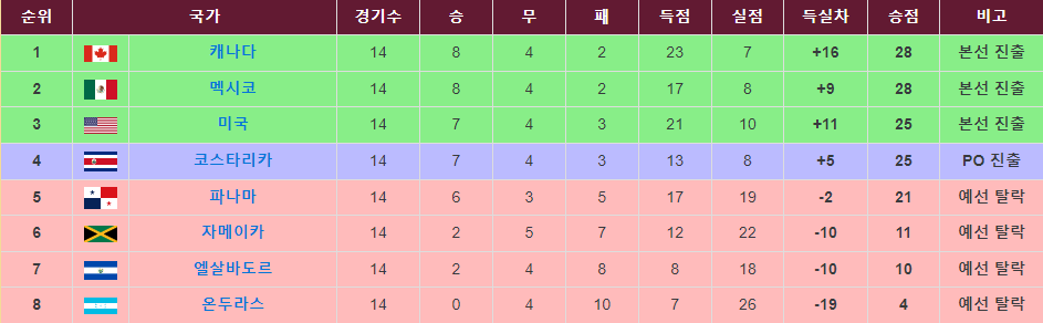 코스타리카 또한 어렵게 월드컵 본선에 진출했는데요. 코스타리카가 속한 북중미 지역예선 결과를 보시면