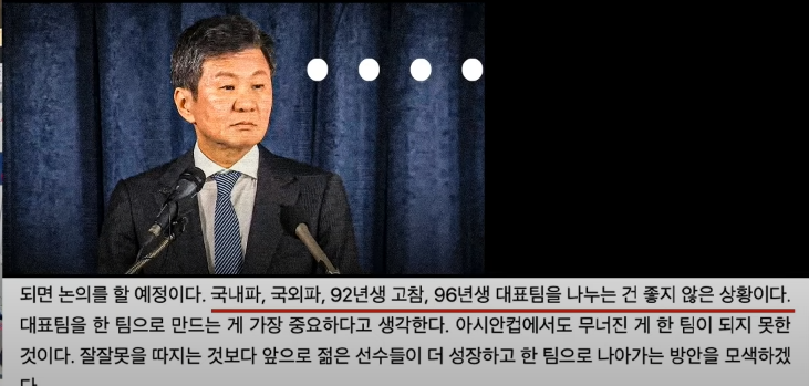 정몽규회장 자체가 불난집에 부채질을 한겁니다. 웃을수도 없는건 손흥민 인스타에 "일각에서 나오는 이야기들 중에 대표팀내 편가르기에 대한 내용은 사실과 무관" 하다는걸 손흥민이 대신 대답한것처럼 늬앙스가 풍긴다라는겁니다.