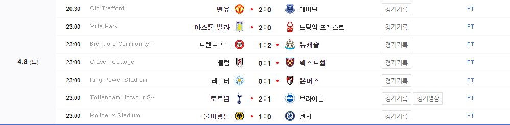 오늘 경기 결과입니다. 챔스진출의 경쟁 상대인 맨유와 뉴캐슬 모두 승리했네요. (토트넘 오늘 졌으면 큰일 날뻔)