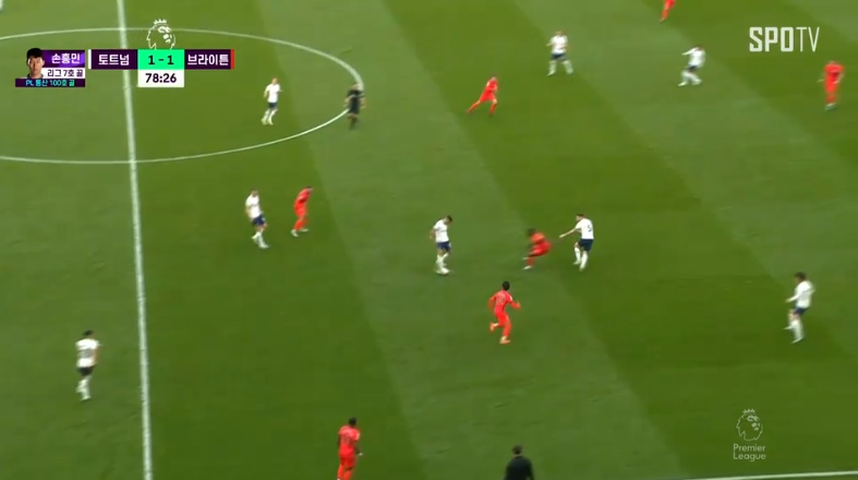 패스를 받은 손흥민은 뛰어들어가는 호이비에르에게 전매특허 가랑이 패스를 합니다.