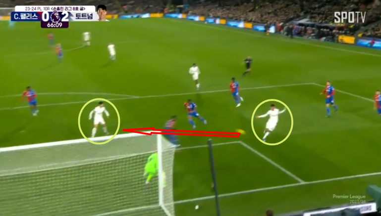 순간 수비수가 브레넌존슨에게 눈이 쏠려있을때 논스톱으로 골문 중앙에 있는 손흥민에게 패스를 합니다