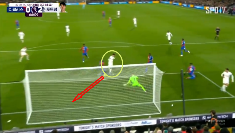 뒤쪽에서 수비 백업이 들어왔지만 이미 늦었고 손흥민은 다이렉트로 골인에 성공합니다.