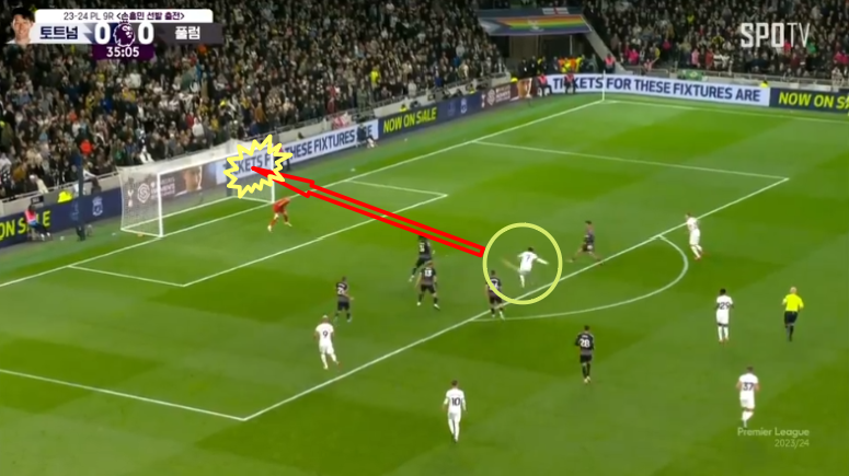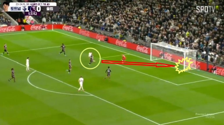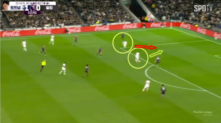 손흥민이 볼을 잡았을때 수비수가 들어오는 타이밍에 메디슨이 위쪽에서 들어옵니다. 메디슨에게 살짝 공을 밀어주어 골키퍼와 1:1 찬스를 만들어 주는 손흥민이죠