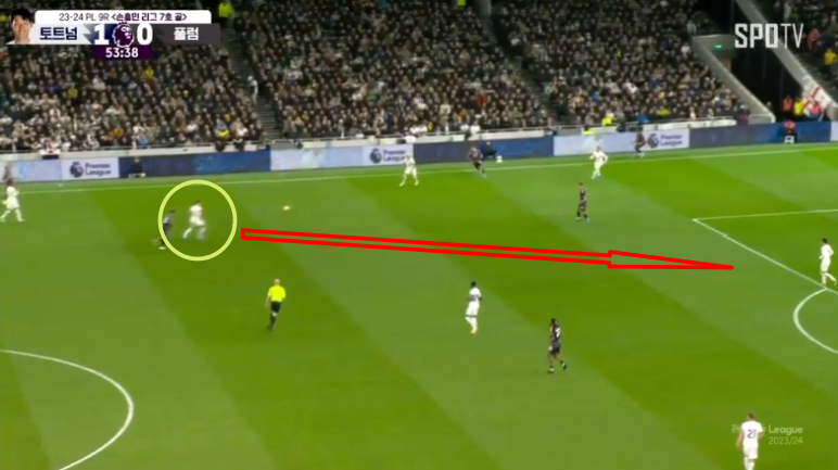 히샬리송은 받자마자 손흥민에게 빠른패스로 이어지는데 골키퍼 앞으로 뻥뚫려있죠? 수비수가 다급하게 손흥민을 마크하러 들어오는데