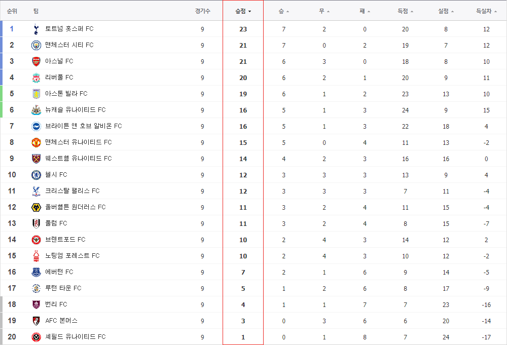 리그 경기가 이제 1/3 정도가 거의 다 되어 가는데 토트넘의 성적이 계속 순조롭게 가서 정말 다행이라고 생각되네요. 현재 9R까지의 순위는요~