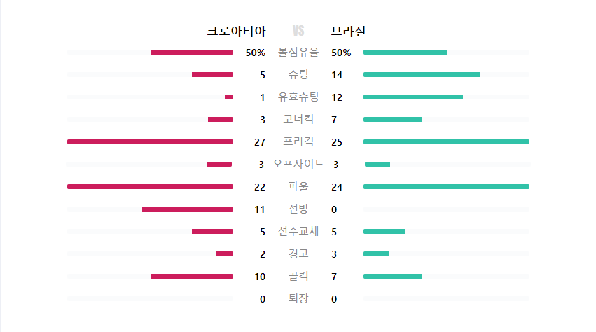 똑같은 볼 점유율에 이런 기록이면 아무래도 공격의 기회를 브라질이 잘 살렸다는 의미가 되겠네요.