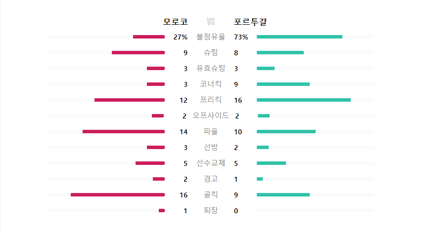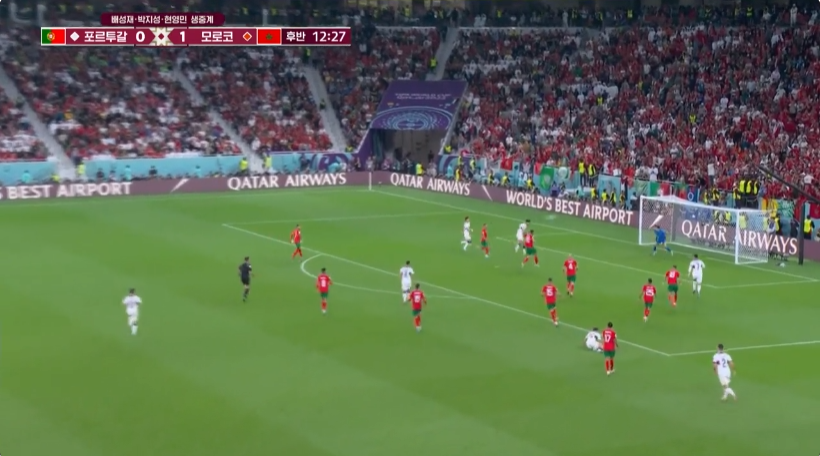 모로코는 스페인전과 마찬가지로 점유율은 많이 가져가지 못했지만 역습에 의한 공격이 정말 날카로왔고 위협적이였습니다. 반면에 포르투갈도 공격면에서는 정말 매서웠는데요 오늘은 스위스전때와는 달리 골운이 정말 없었다고 봐야 할것 같습니다.