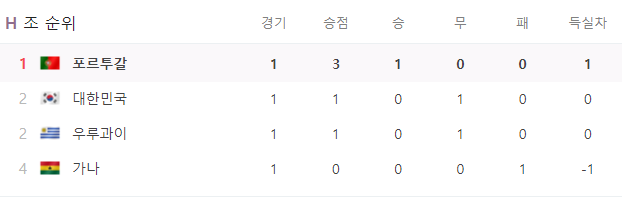 어제는 대한민국의 경기 때문에 모두 TV에서 눈을 못때셨을것 같은데요.. (배달앱도 트래픽이 위험했음 ㅠㅠ) 한편으로는 너무 잘한경기, 한편으로는 우루과이 경기력에 비해서 우리가 이길수 있었던 경기로 많이 평가하시는것 같았습니다. 하지만 우루과이 경기를 보면서 포르투갈과 가나의 경기에 희망이 보이는건 사실인것 같았습니다. H조의 다음 일정 공유하고 다음 A조에서 H조까지 한경기씩을 더하면 또 올리겠습니다 감사합니다