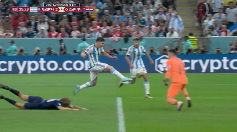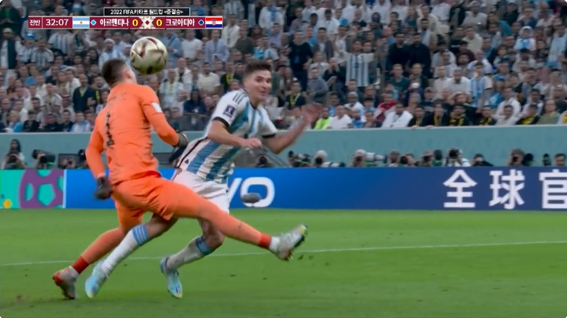 알바레스가 공간침투를 하면서 패스를 받고 골키퍼와 1대1 찬스를 만들고 크로아티아 골키퍼가 전진하면서 방어를 했는데요. 너무 앞으로 갔는지 접촉이 일어났고, 몸이 엉키면서 심판은 파울을 불었네요