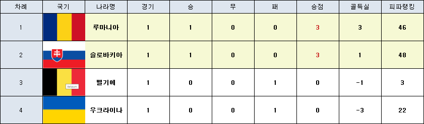 일반적으로 우리가 아는 강팀들이 모두 1승을 거두었는데요. 한팀 벨기에만 슬로바키아에 일격을 당해 승점을 올리지 못했는데요. 하지만 슬로바키아는 최근 7경기에서 패한경기가 한경기밖에 안됐다는것을 봤을때는 탄탄함을 보이는 대목이고 예선에서는 조2위를 차지했었죠!!