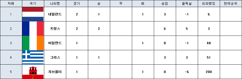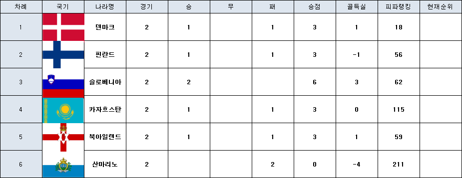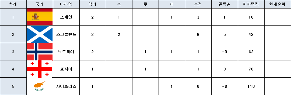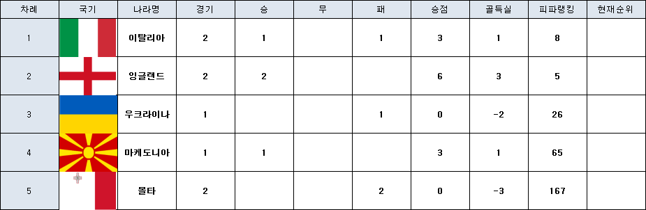 | EURO 2024 예선 조별 리그 9월 일정 종료 현재 조별 순위 및 조별 피파랭킹 (0) | 2023.09.14 |
