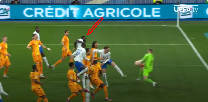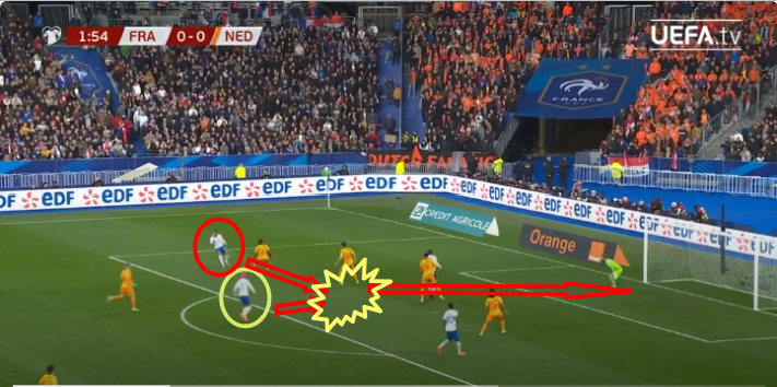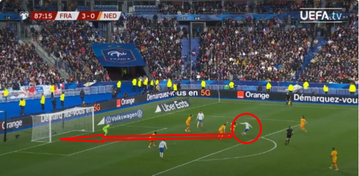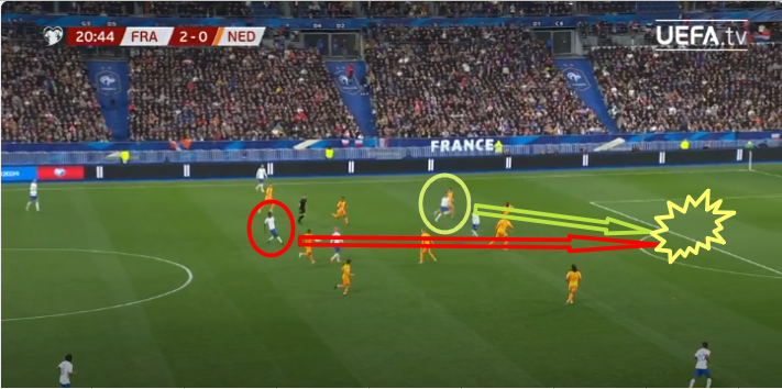 전반 22분여쯤에 추아메니가 후방에서 침투패스를 찔러 넣어주고 음바페가 뒷공간에서 파고들어서 노마크를 만든뒤 직접 골사냥에 성공합니다, 캡쳐에는 안보이지만 침투패스 중간에 있는 프랑스의 무아니 선수가 공을 받는 척하며 네덜란드의 수비진을 속여서 음바페의 침투가 더 쉬워졌네요! 훌륭한 페이크!