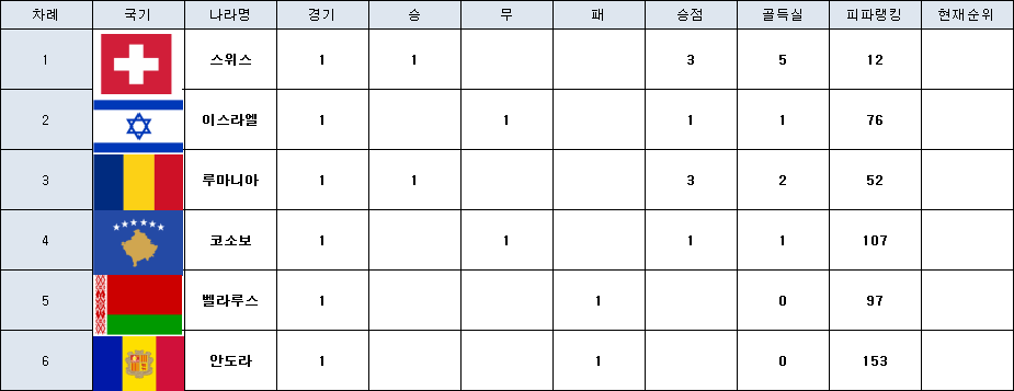 I조는 스위스가 문안하게 본선에 진출할것으로 예상되구요. 조2위싸움은 이스라엘과 루마니아 싸움이 될것 같습니다.