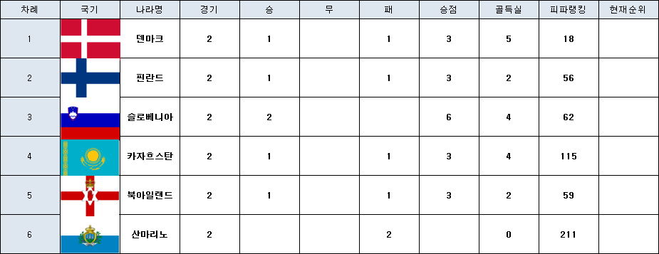 덴마크가 카자흐스탄에게 일격을 맞고 팀분위기가 괜찮을지 궁금하구요. 이후에 덴마크와 슬로베니아와의 경기가 순위싸움에 변동이 클것같고, 핀란드, 카자흐스탄, 북아일랜드가 모두 승을 쌓고 있어서 진흙탕 싸움이 될수 있겠네요!!