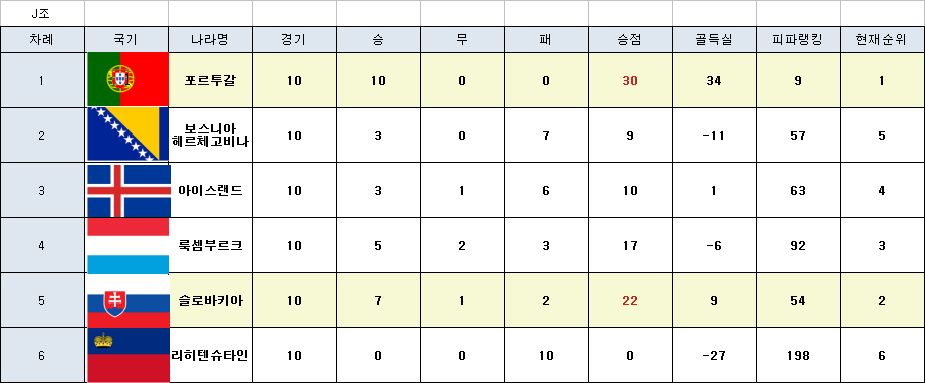 포르투갈의 무패 본선진출 대단하네요. 승점 30점!! 골득실 34 예선 모든 국가를 통틀어 1위의 기록입니다.