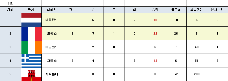 B조는 프랑스와 네덜란드의 압도적우세로 예선에 마무리 되었네요