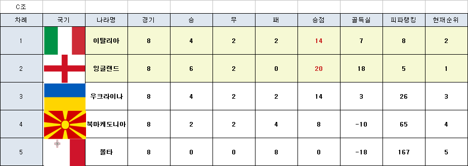 C조는 이탈리아가 겨우 본선행 티켓을 잡았네요 우크라이나와 승점이 같았으나 골득실에서 이탈리아가 앞섰네요