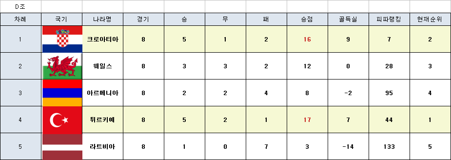 크로아티아의 1위를 예상했지만 터키도 만만치 않네요 D조는 에상된 결과인것 같습니다
