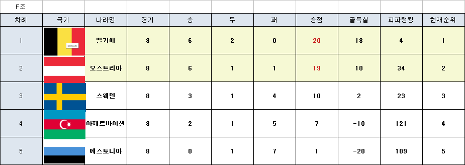 F조는 벨기에, 오스트리아, 스웨덴의 경쟁이 치열할것으로 보였는데 스웨덴의 뚝심이 부족했던듯