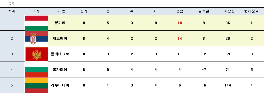 G조도 예상된 국가가 1,2위를 차지했네요. 개인적으론 세르비아가 1위를 할줄 알았음 ㅋ