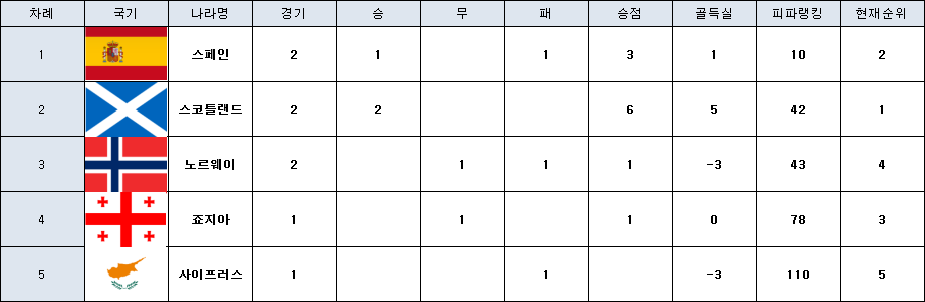 현재 A조 상황입니다. 스코틀랜드와 스페인, 노르웨이만 2경기씩 소화했고 죠지아와 사이프러스는 1경기만을 소화했네요