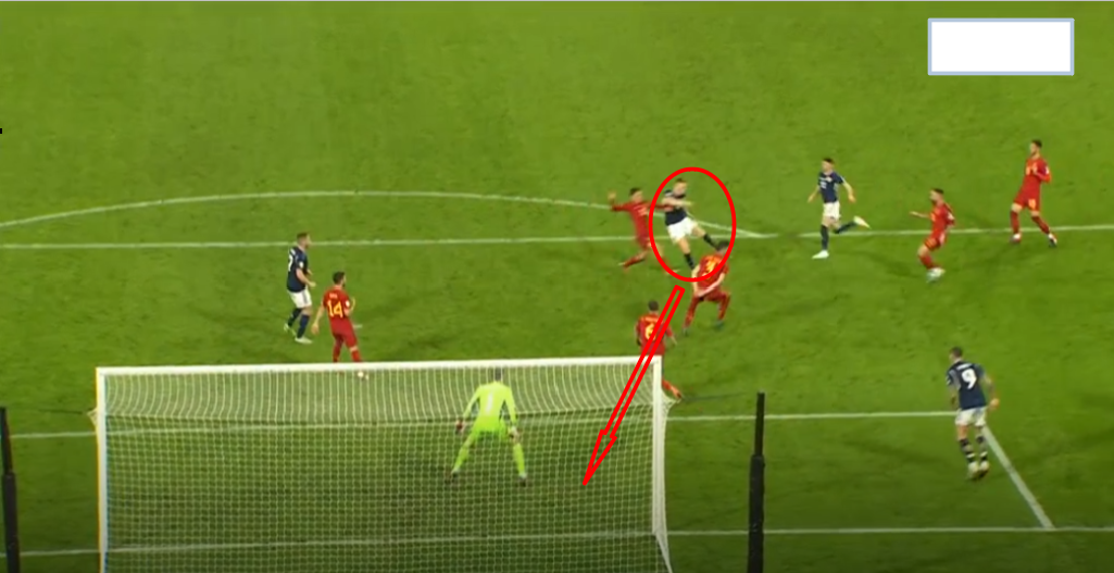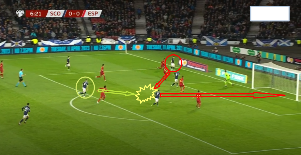 스코틀랜드는 좌측에서 공간침투패스를 했으나 수비수에게 막혔는데 수비수가 비끄러움에 넘어지는 바람에 다시 가로채서 앤드라인에서 패널티라인 중앙으로 패스 들어오는 공격수가 가볍게 골인시킵니다.
