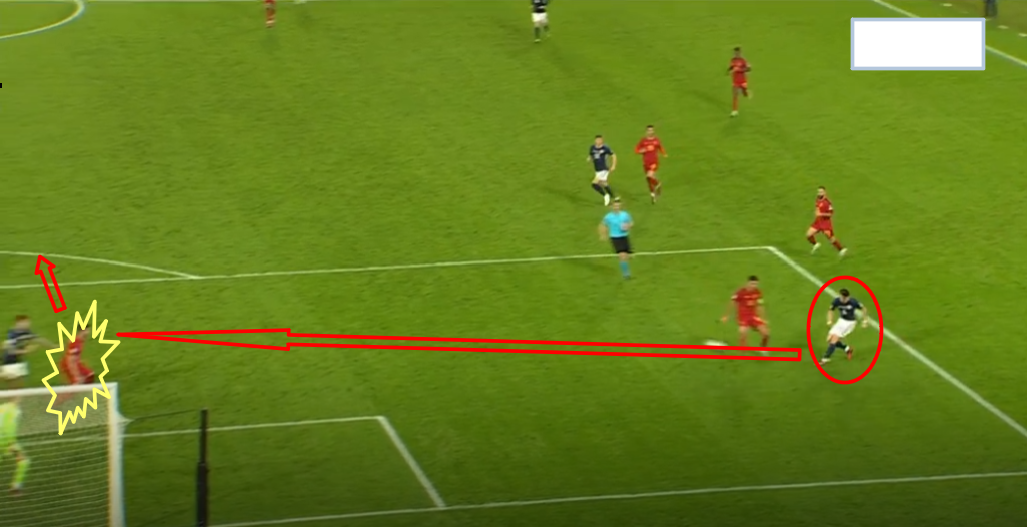 우측라인을 완전히 뚫고 들어와서 패널티라인 우측에서 중앙으로 패스 수비수 맞고 굴절됐으나